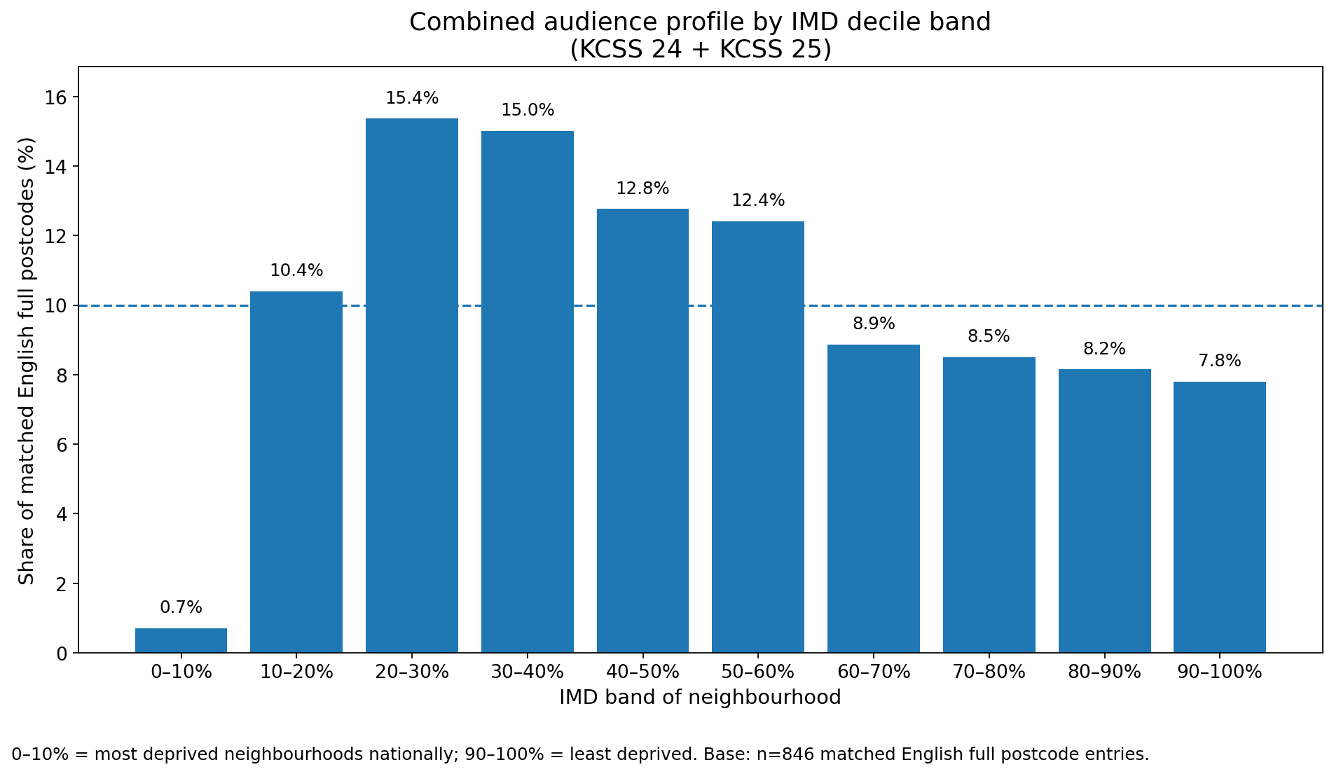 The socioeconomic profile is equally important. Across the combined English full-postcode sample, 26.5% of audience postcodes fall within the most deprived 30% (IMD) of neighbourhoods in England, while 54.3% fall within the most deprived half. Only 24.5% fall within the least deprived 30%. Postcode data cannot tell us an individual attendee’s income, household situation or mental-health status. But it can tell us something meaningful about the places people are coming from. On that basis, KCSS is reaching a socially mixed audience and a substantial share of communities where disadvantage is more likely to shape everyday life.