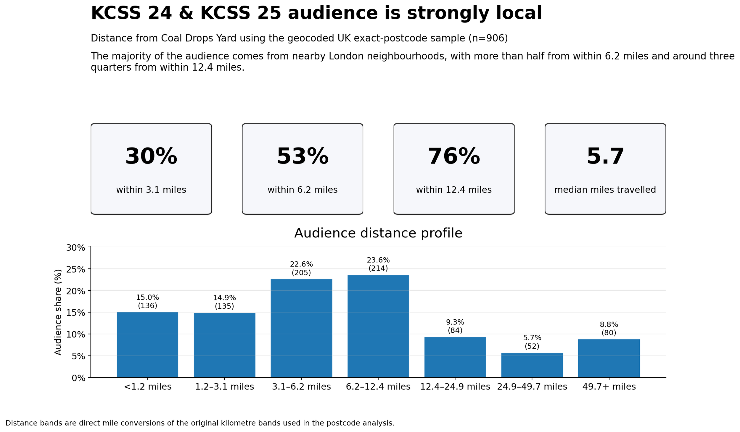 The clearest story in the data is that KCSS is genuinely local. The audience is overwhelmingly London-based, with a particularly strong concentration in north and inner London. The biggest audience clusters come from boroughs such as Islington and Camden, and postcode districts such as N1, NW1 and N7 stand out strongly. More than half of the exact-postcode audience sample across 2024 and 2025 came from within 6.2 miles of the festival site, and around three quarters came from within 12.4 miles. Therefore this is not primarily a destination audience. It is a local and city-regional audience, rooted in the neighbourhoods around King’s Cross.